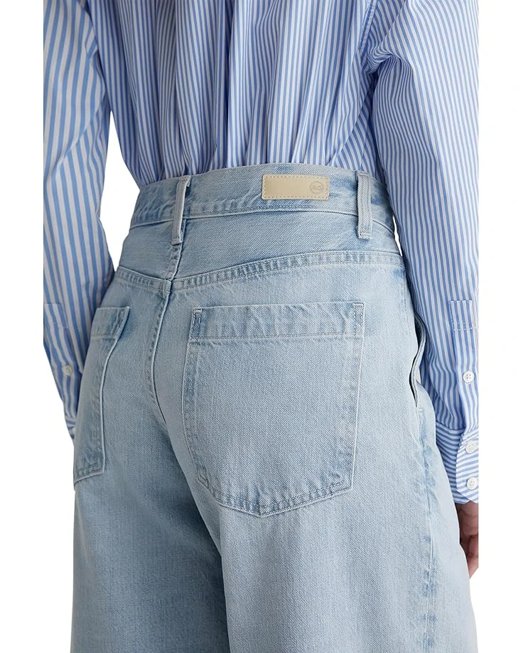 - Create stunning looks everytime wearing AG® Jeans Stella Mid-Rise Wide Leg Palazzo Jeans in Idol. The loose fit, high-rise jeans features a flat front design, belt loops on the waist, a zip-fly & button closure, and a boxy top block, meant to be worn low slung and a super wide full length inseam. The two slanted pockets on the front and two patch pockets on the back add functionality to the look.