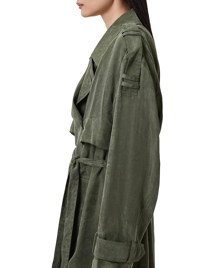 - Make a statement wearing the AllSaints™ Linnie Trench coat. With its classic notched lapel collar, stylish long sleeves with belted cuffs, and an adjustable removable tie belt, this coat offers both sophistication and versatility. The gun flap detail and buttoned front closure provide a touch of urban edge, while the storm flap and back vent deliver practicality and comfort.