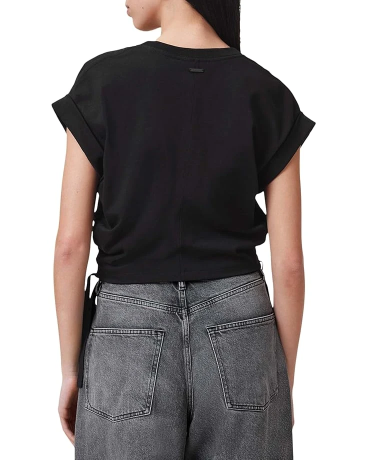 - The AllSaints™ Mira Satin Tee is a must-have addition to your wardrobe for effortless style. Made from a lightweight fabric with a slight stretch, this tee offers a relaxed fit that is perfect for everyday wear. Featuring a round neck, short sleeves, and gathered sides with adjustable drawcords, this cropped design is both fashionable and comfortable.