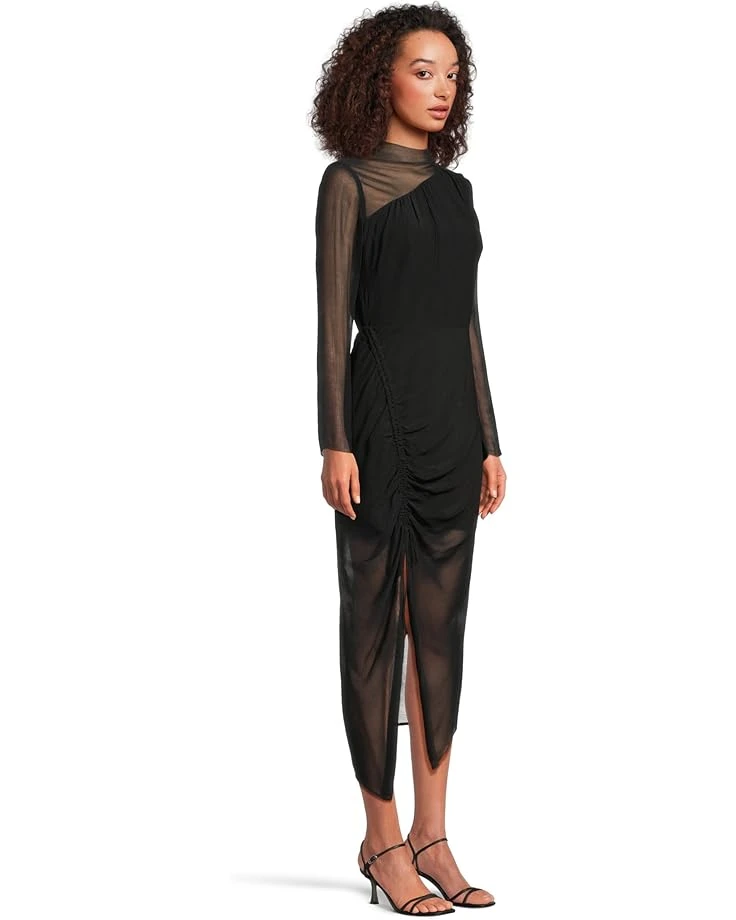 - Style up your look and raise the glam quotient wearing AllSaints™ Rizo Dress. The dress features a mock neck, long sleeves, ruched detailing at the side waist with a tie-up detail at the leg, and a flattering below-the-knee silhouette. The allover printed details elevate the style.