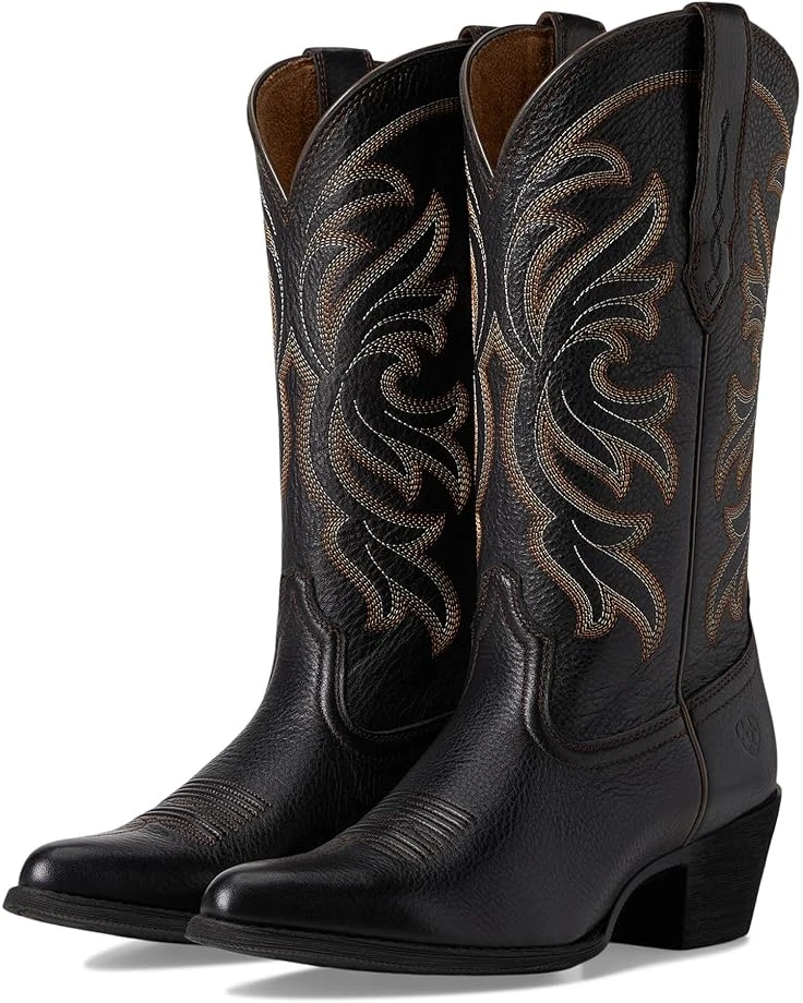 - Take on any terrain with confidencewearing the Ariat® Heritage J Toe Stretchfit Western Boots. The leather upper and lining provide durability and style, while the removable all day cushioning insole ensures all-day comfort. With a six-row stitch pattern and ATS® technology for ergonomic support, these boots are perfect for those long days on your feet. Plus, the StretchFit panels under the pull tabs give you an additional inch to fit a wide range of calves.