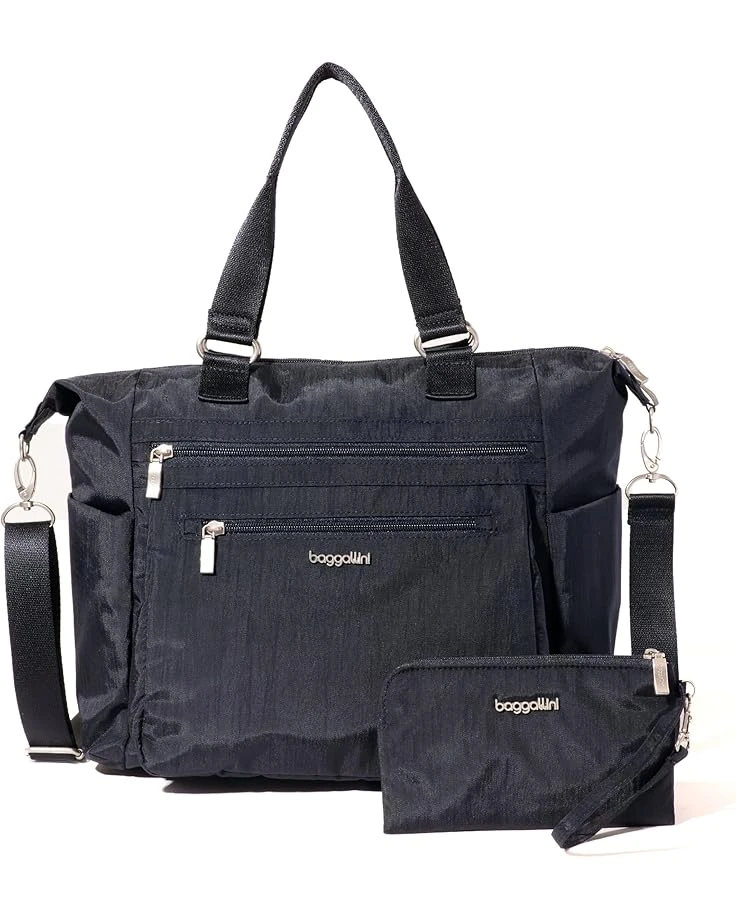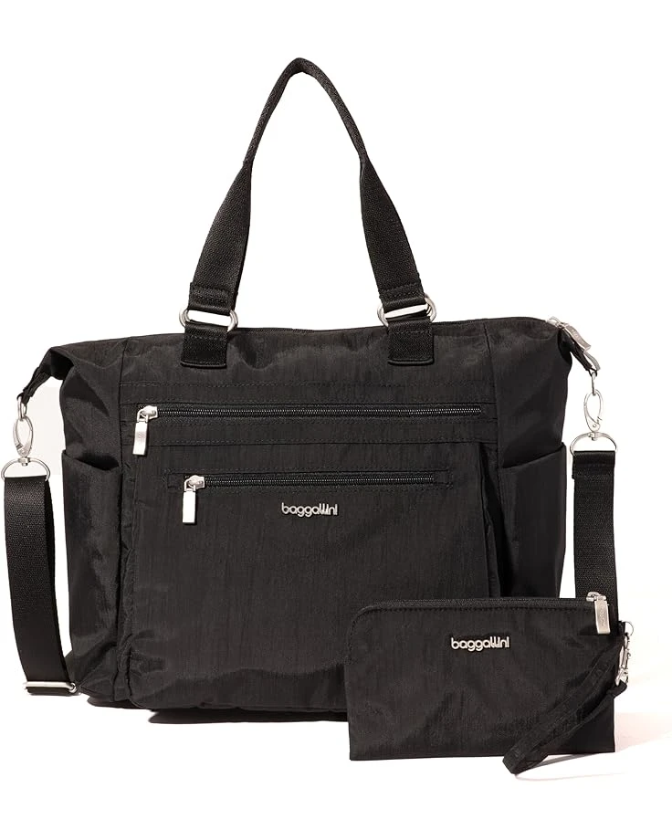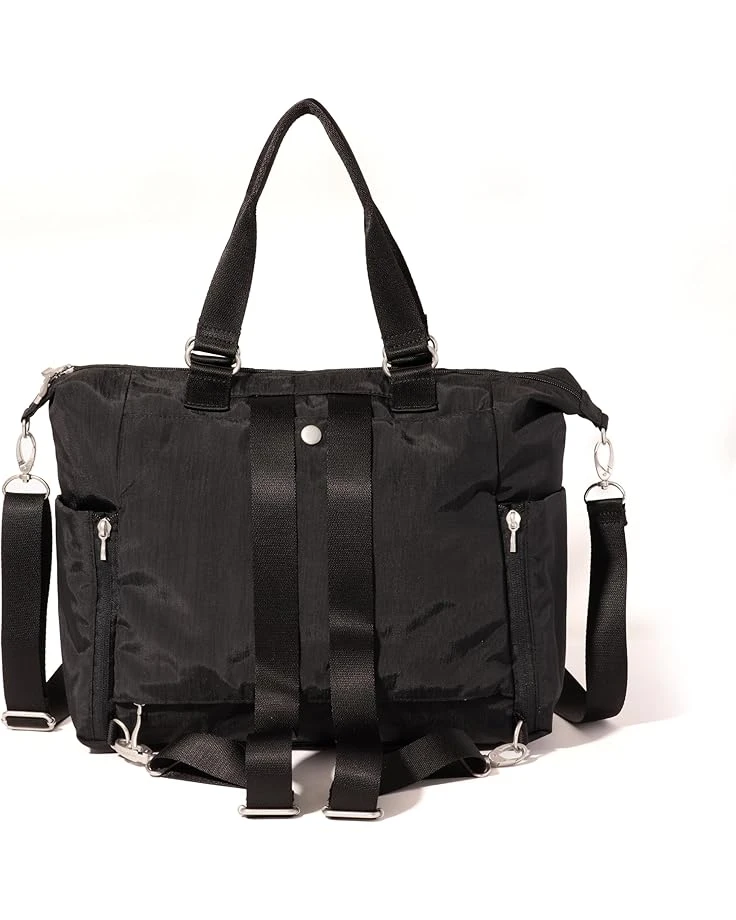 - Style that adapts, function that dazzles-meet your ultimate travel companion! The Baggallini® Trifecta Convertible Backpack combines modern versatility with everyday ease. Made from durable nylon with a smooth lining, it features an interior privacy pocket, nine total compartments, and an expandable water bottle pocket. Switch effortlessly between backpack, crossbody, or tote modes with adjustable, tuckable straps and a detachable crossbody option. Stay organized on the go with a scratch-resistant phone pocket and a handy luggage sleeve for travel.