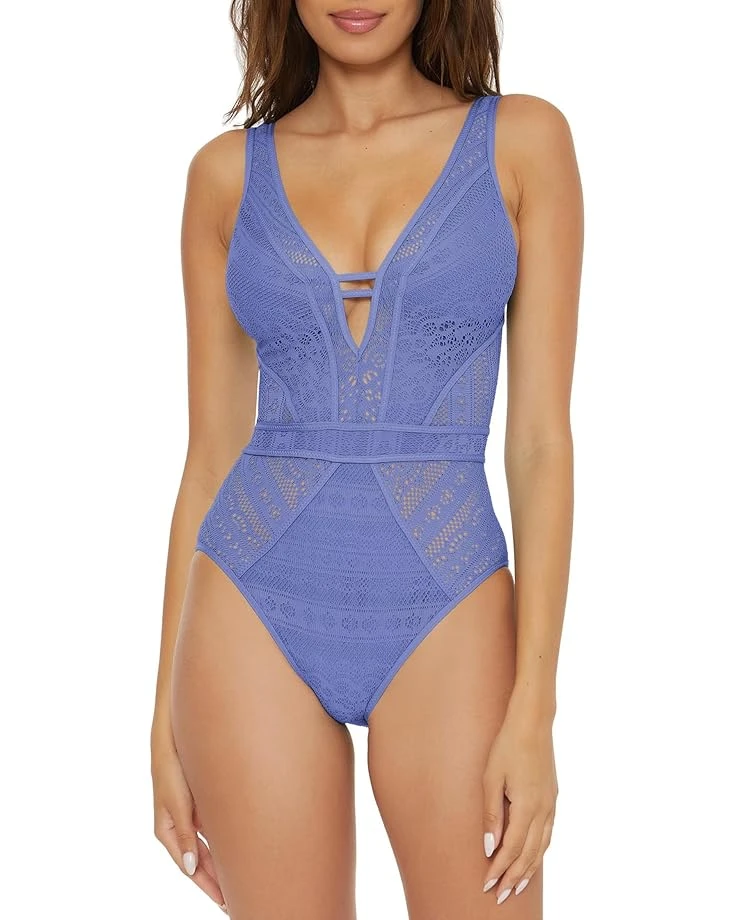 - Be ready for any vacation in the BECCA® Color Play Crochet Plunge One Piece swimsuit. The adjustable straps pair with a self-tie in back for a secure fit. The sheer crochet detailing allover creates a playful style that compliments every shape.