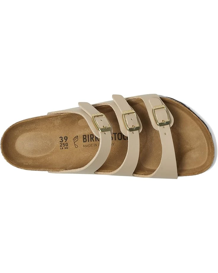 - Take every step with style and enjoy superior comfort wearing Birkenstock® Florida Birko-Flor™ Sandal. The open round-toe sandals are designed with a Birko-Flor faux leather upper and three adjustable straps with metal pin buckles. The suede lining helps keep you comfortable and the contoured cork-latex footbed creates custom support with wear.