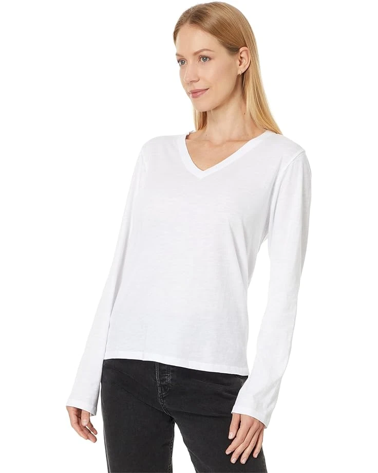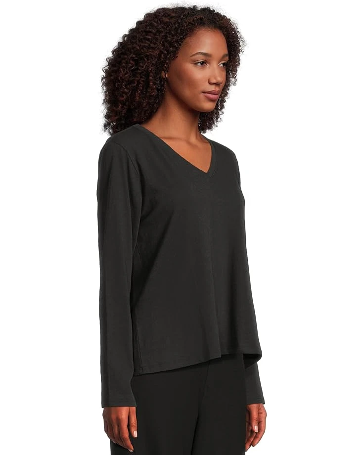 - Feel the utmost comfort wearing Eileen Fisher® V Neck Long Sleeve Tee. Soft and light, this organic cotton jersey has visual texture that comes from a very fine slub yarn. It is grown using regenerative farming methods that support soil health and biodiversity. The pull-on tee features a V-neck, long sleeves, and straight hem.