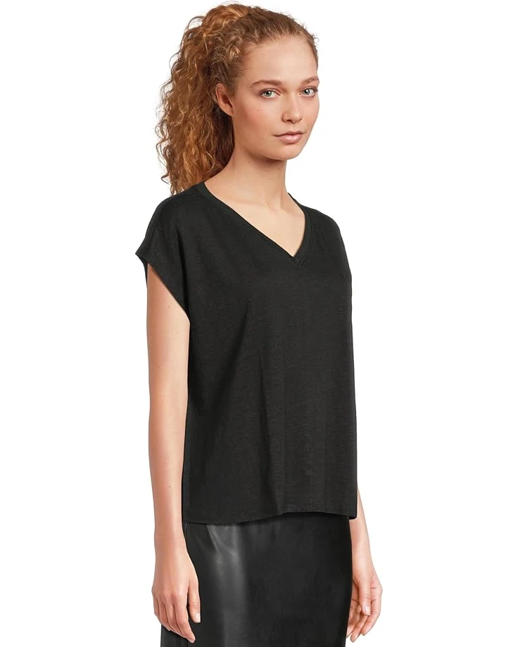 - Stand out with your unique fashion dynamics wearing the lightweight EILEEN FISHER® V Neck Square Tee. With organic linen fabrication, the pull-on top features a banded V-neckline and cap sleeves.
