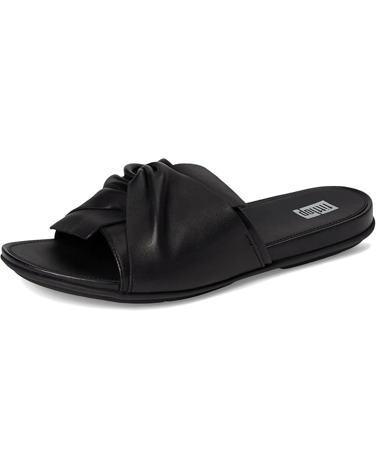 - The FitFlop™ Gracie Soft-Twist Leather Slides take ‘sleek’ to the extreme. They look like the kind of chic flats that can be hard work to walk in, but slip them on and you’ll think you’re in sneakers. Thanks to their anatomically contoured EVA-foam footbed and FitFlop’s Dynamicush™ cushioning hidden in the faux-leather wrapped rubber outsole that maximizes comfort. They are crafted in a luxe butter-soft nappa leather upper with a soft sculptural leather bow detail. The rubber insole and polyester lining provide added comfort. Their concealed elastic insert enhances the fit. These flat sandals are ergonomically engineered to help optimize your body’s alignment, natural movement, and energy. APMA-accepted, these slip-on sandals team with almost any warm-weather look.