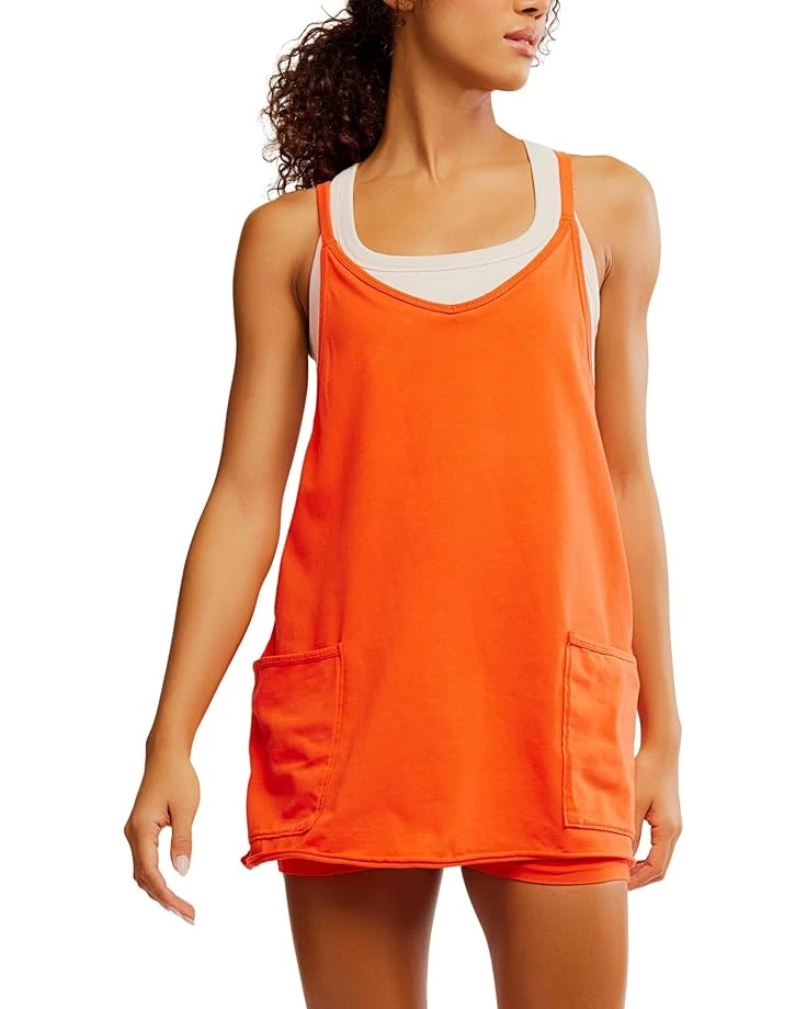- The FP Movement™ Hot Shot Mini Dress is featured in a mini-length silhouette and a lightweight fabrication, making it a perfect warm weather staple piece. The pull-on style dress features a scoop neck, sleek straps, two oversized patch pockets on the front, and built-in shorts.