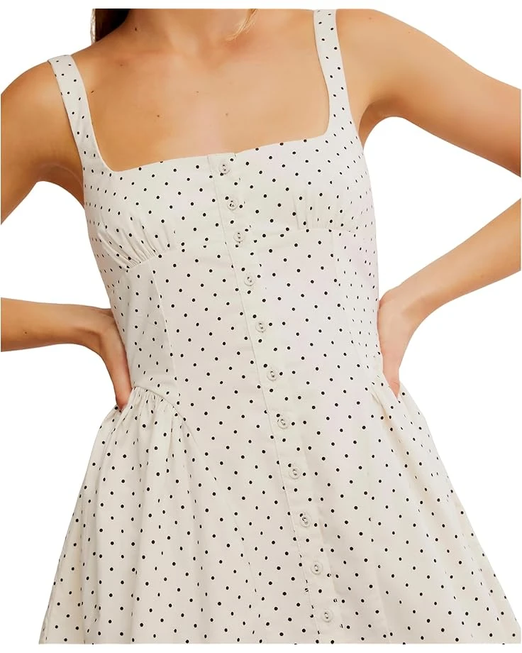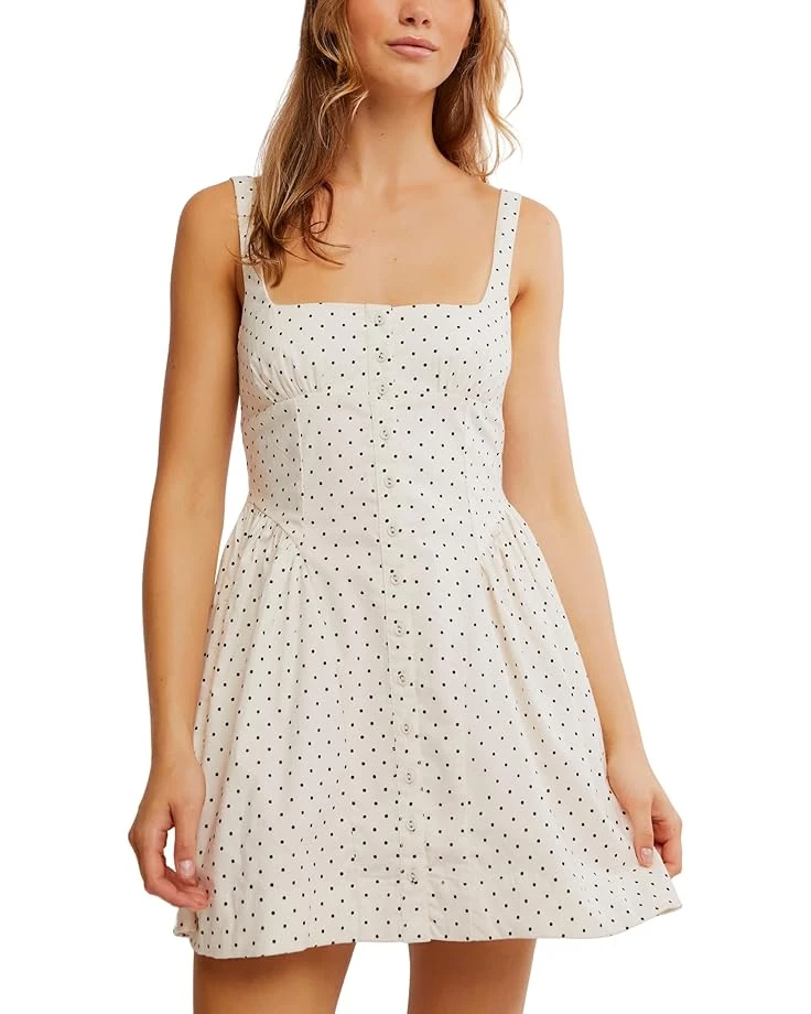 - Twirl into charm wearing the Free People™ Printed Astrid Mini-your ultimate playful yet polished pick! Featuring a corset-inspired design in a timeless polka dot pattern, this sleeveless stunner boasts a flattering square neckline and a breezy A-line silhouette that dances above the knee. The button-front closure adds a touch of vintage flair, making it perfect for daytime adventures or moonlit soirees. Crafted for effortless elegance, this dress combines chic style with carefree comfort.