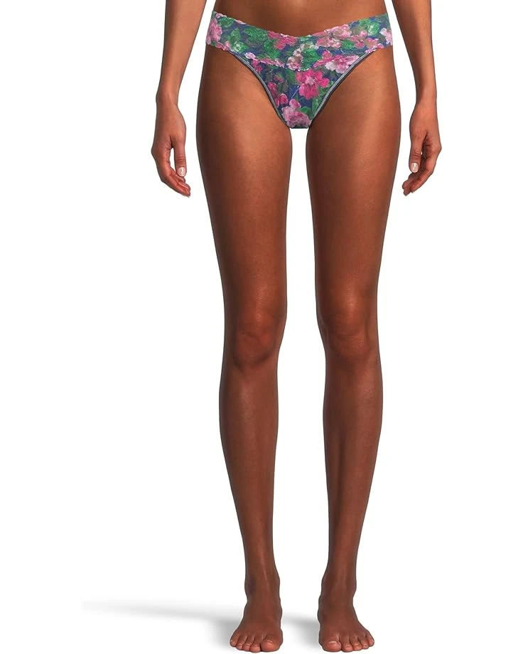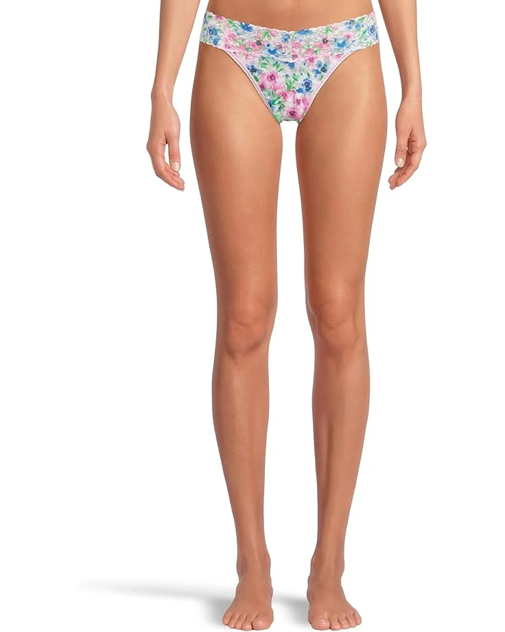 - Feel comfortable and stylish inside out by wearing the Hanky Panky® Signature Lace Printed Original Rise Thong. The pull-on style panty has a regular fit with the mid-rise silhouette. It boasts a V-shape front and back with signature lace detailing at the elastic waistband for elevating the aesthetics effortlessly. The thong features an intricate print allover.