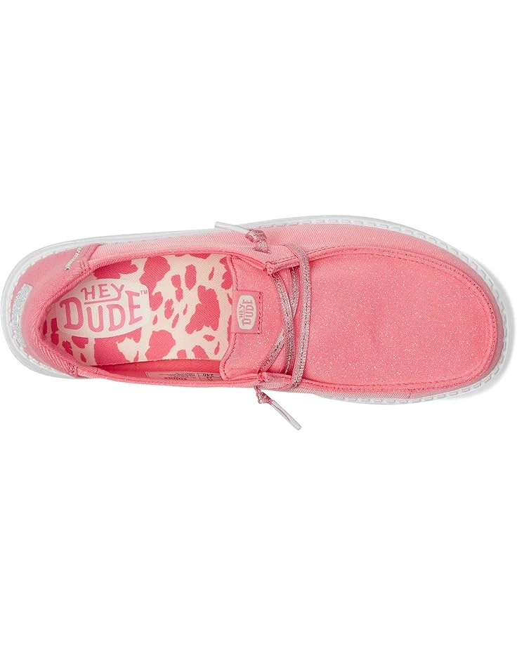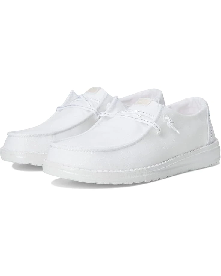 - Calling all stars! The Hey Dude® Wendy Stardust is THE travel-ready slip-on that lets you shine. With a shimmery textile upper and a touch of rhinestone heel bling, this ultra-lightweight go-to is comfort and confidence on the go. Pick these sneakers for a perfect casual evening outing in the city. The shoes have moc toe and slip-on style with two-eyelet elasticized panels. The flat platform makes it comfortable for daily walks. The shoes are made of leather and textile upper. It is lined with textiles and features a removable textile insole.