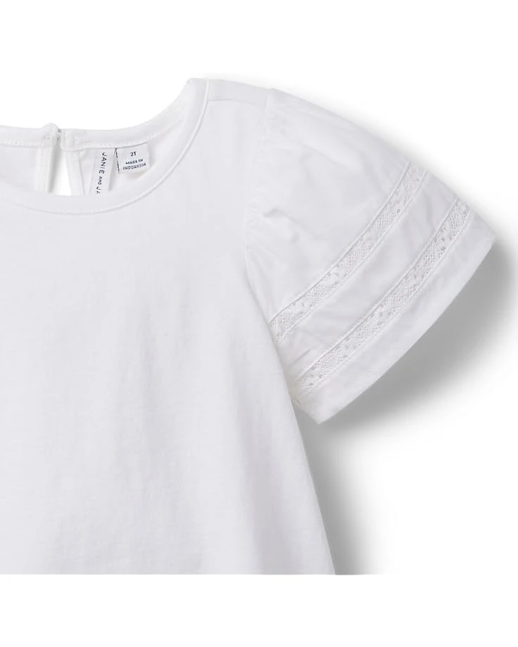 - From jeans to leggings, she’ll look flawless in the Janie and Jack® Lace Sleeve Top. Crafted from cozy cotton, this shirt offers a crew neckline with a keyhole button back closure, wide puff sleeves with lace detailing, and a straight hemline.