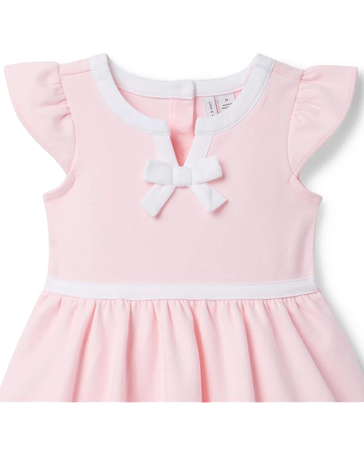- The Janie and Jack® Ponte Dress is sure to make a terrific addition to your little ones wardrobe. The ponte dress comes with a crew neck with a contrasting collar with striped detailing and ruffles on the ends. It features cap sleeves, a half-button closure, and a knee-length skirt with ruffled detailing.