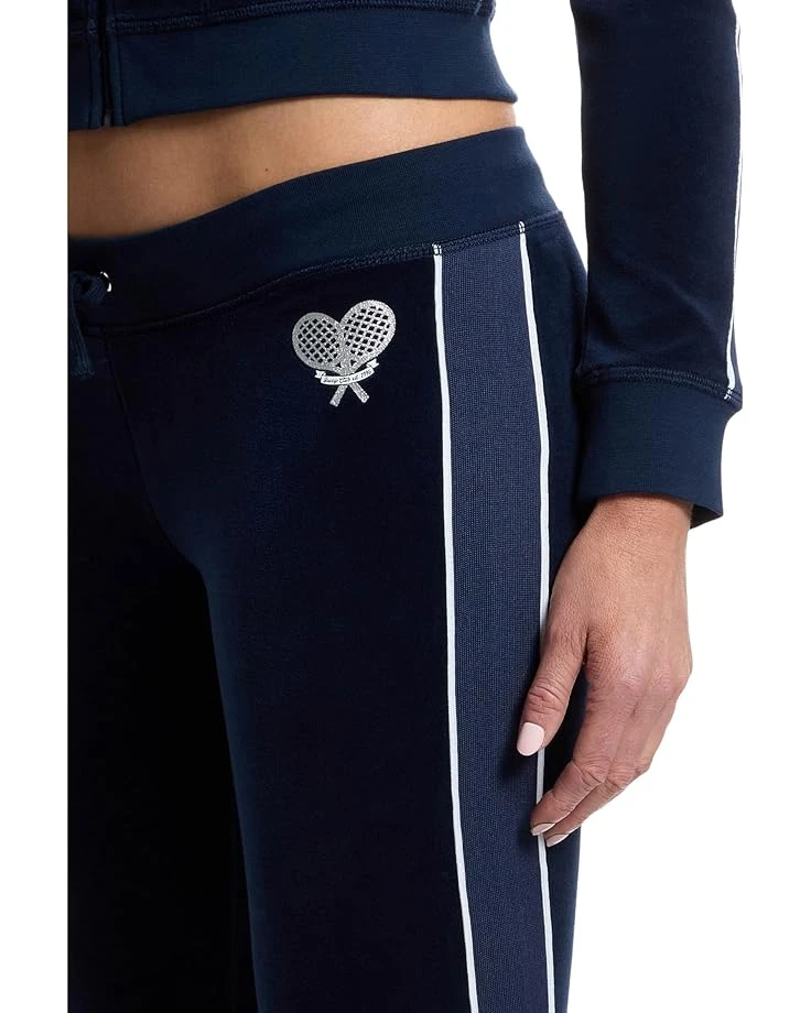 - Velvet reverie: Juicy Couture® Heritage Low Rise Track Pants With Side Stripe. Crafted from ultra-soft cotton velour, these track pants redefine sporty-chic with a high-rise fit, sleek flat front, and pull-on ease. The adjustable drawcord closure ensures the perfect fit, while the striped side trim adds a pop of retro-cool energy. Whether you’re channeling ’90s nostalgia or elevating your athleisure game, this piece is a must-have from the exclusive tennis capsule.
