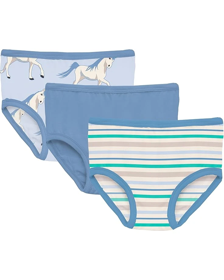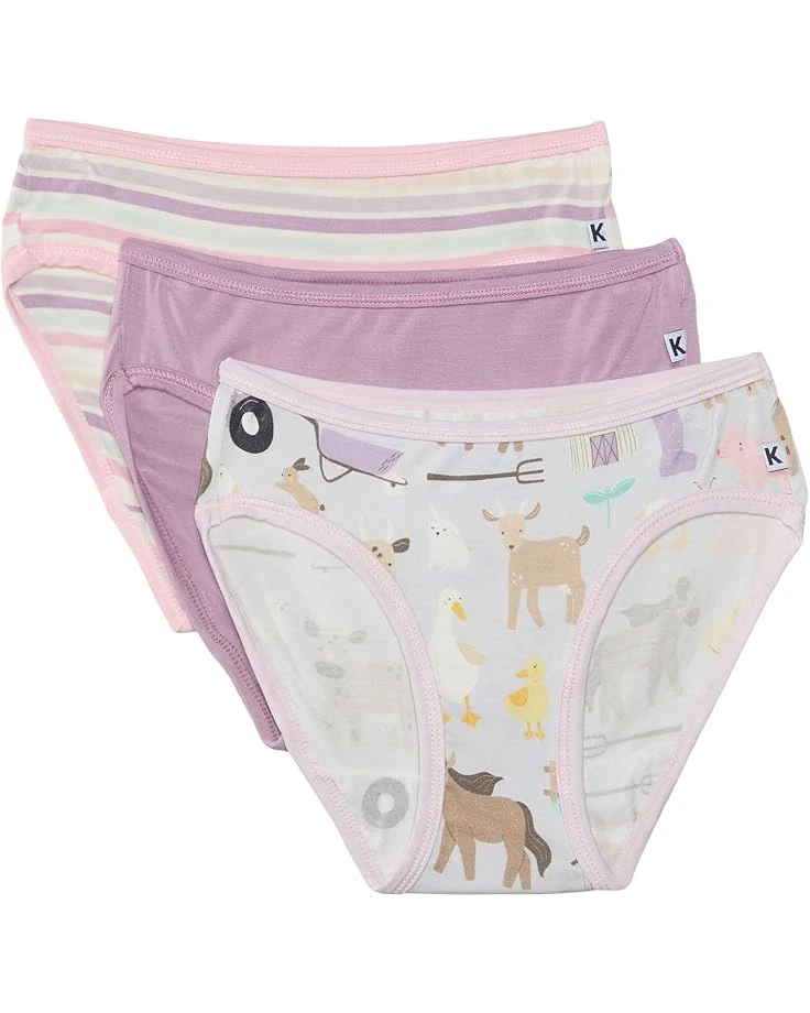 - Keep this Kickee Pants™ Kids Print Girl’s Underwear Set of 3 in your wardrobe to get a convenient layer for your intimates throughout the weekdays. They have incredibly soft & stretchy construction with moisture-wicking and tag-free design. The mid-rise elasticated waistband and classic-cut legs allow easy movement. Allover floral fun prints and solid colors make the pants chic in look.