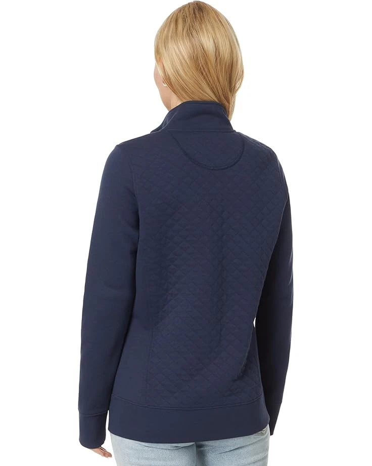 This is the third quilted full-zip I have purchased. Love the fit for me (5′, 115) in a petite XS. Not too tight, not too loose. Looks great as a stand-alone piece or layered under a jacket or coat.