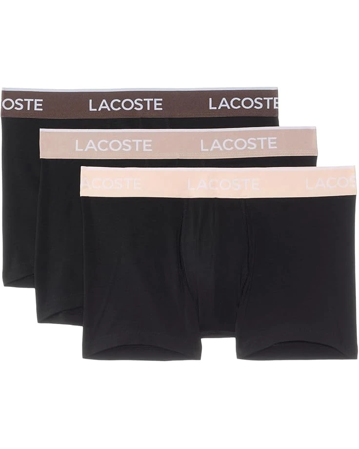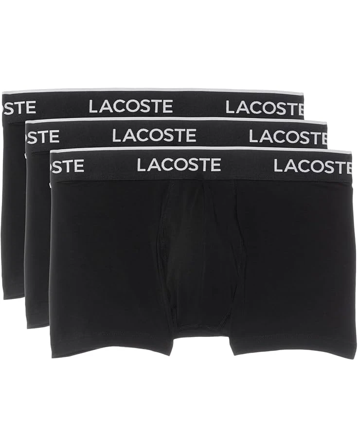 - The Lacoste® Cotton Stretch Essentials Trunks 3-pack offer all-day comfort and support for various activities. These feature a comfortable mid-rise elastic waistband and a soft brushed interior that prevents irritation when worn. The allover branded waistband with contrasted wording and stripe on top adds an authentic touch.These are expertly designed to provide a secure fit that stays in place without pinching or discomfort.