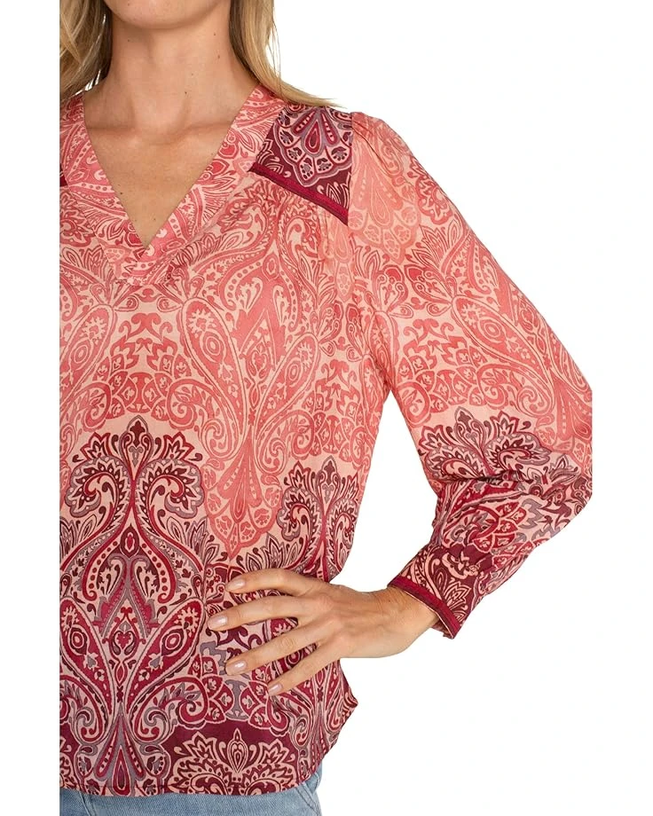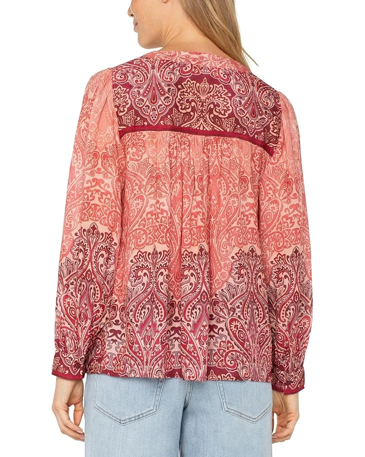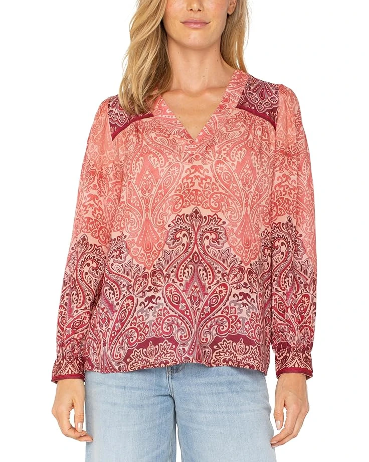 - Uplift your mood with the classic style Liverpool™ Los Angeles Long Sleeve V-neck Popover Woven Blouse. This top features paisley pattern allover, pull-on style, and straight hem. This top is perfect for brunch or special occasions. Pairs with denim or trousers effortlessly!