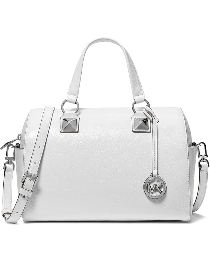 - Present your luxe look donning the MICHAEL Michael Kors® Grayson Medium Duffle Satchel. The shiny and lustrous bag features one adjustable crossbody strap, allover iconic repeated brand detailing, and one main compartment.