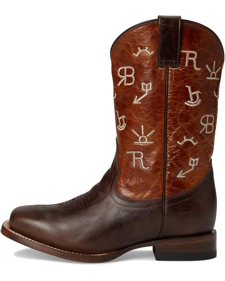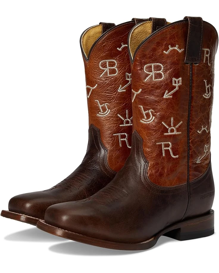 - Let your little one walk from the barn to the backyard wearing the Roper® Kids Brand. Crafted from leather upper, lining, and reboot removable insole, this pair of boots features square toe marbled brown leather vamp, embroidered brands on burnish tan leather shaft, block heel, double welt sole with nails, mid-calf silhouette, side pull tabs, and pull-on style.