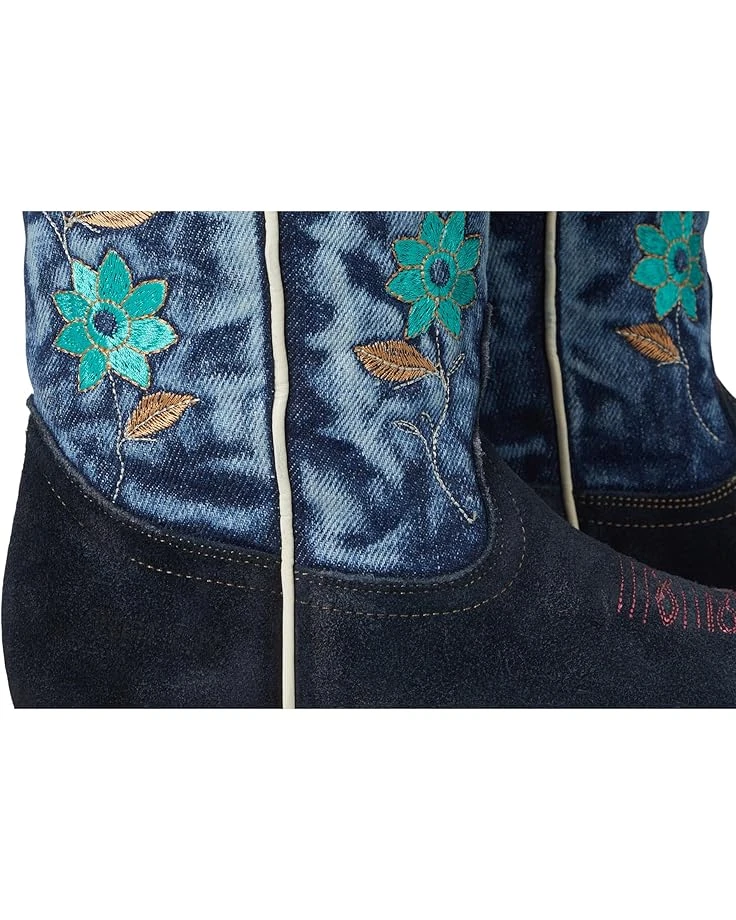 - Let your little cowgirl shine in the Roper® Kids Flower Power boots-where classic Western charm meets vibrant floral fun! Crafted with a blue suede vamp and a vintage blue denim shaft, these beauties bloom with intricate embroidered flowers for a stylish, playful touch. Designed for all-day comfort, they feature a reboot removable insole and a double welt sole with nails for extra durability. The square toe and block heel offer a sturdy step, while the pull-on design makes getting ready a breeze. With a leather upper, lining, and outsole, these calf-high boots are built for adventure, whether on the ranch or the playground.