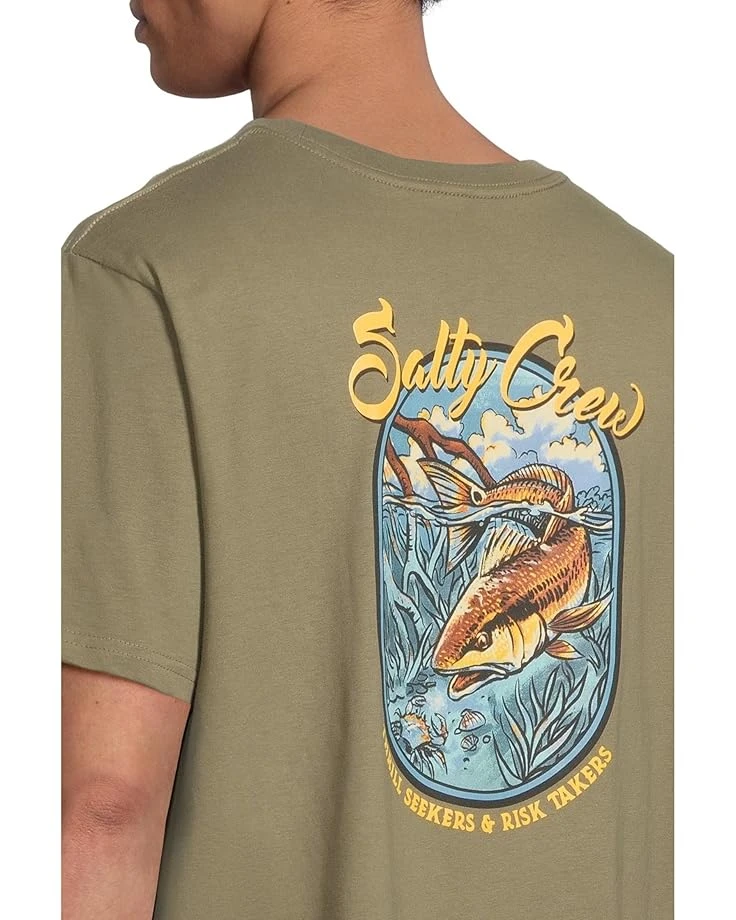 - Upgrade your basics with the Salty Crew® Bruce Short Sleeve Tee. This tee features crew neckline, short sleeves, cool graphic print on the back, brand logo on the front left chest, and straight hem.