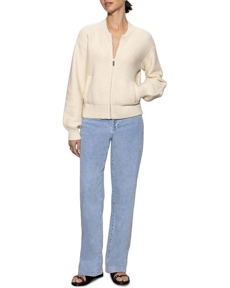 - For those days when the temps drop a little, add a cozy layer of warmth in the Sanctuary™ Knitted Bomber. Crafted from a soft cotton blend, this coat features a traditional bomber collar with a front zipper closure, dropped shoulders, long sleeves, and front hand pockets.