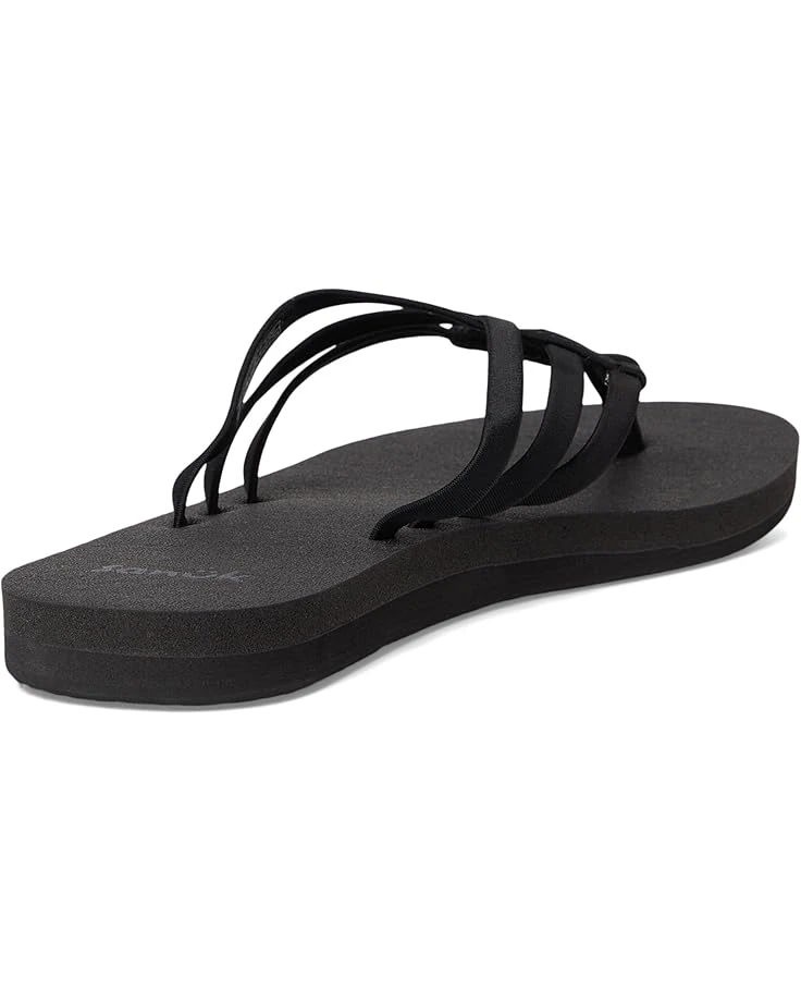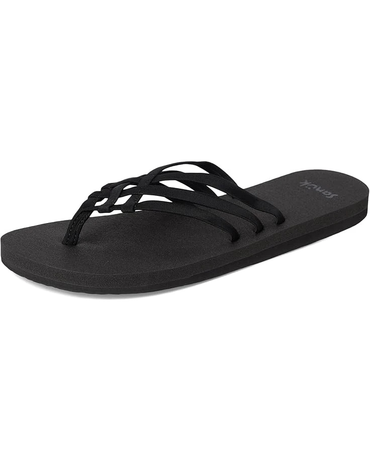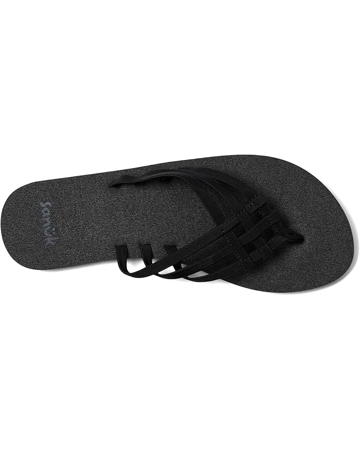 - Featuring a multi-strap polyester upper, the Sanukยฎ Yoga Sandy II slippers are an ideal choice for your everyday wear. The original memory foam Yoga Mat footbed molds to your foot for instantly Om-mazing comfort while the polyester lining provides added breathability. These slide slippers are crafted with a 53% recycled Custom Happy U wave tread sponge rubber outsole for all-day wearability.
