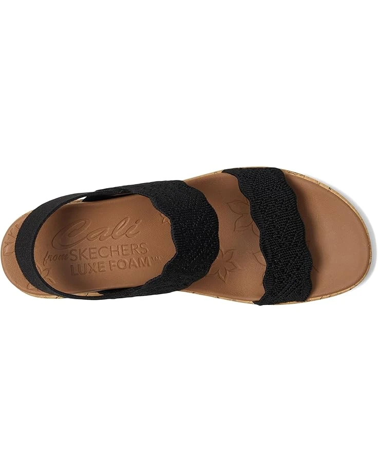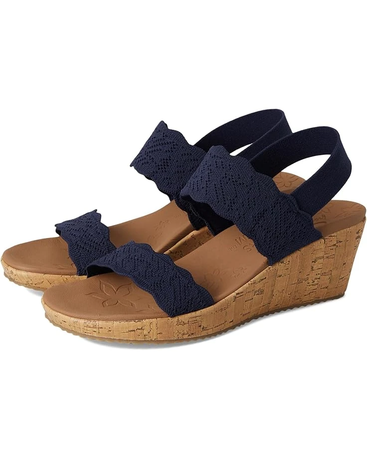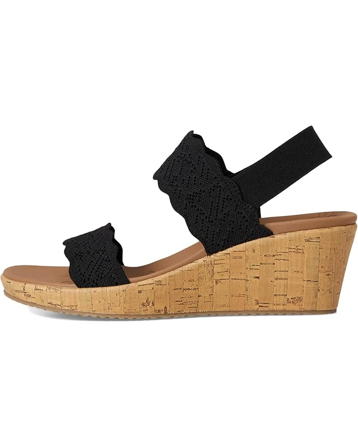 - Summery style and absolute comfort combine in the SKECHERS® Beverlee – Timeless Touch sandals. These heeled sandals feature a crochet scalloped mesh upper with a stretchable slingback strap and a cushioned Luxe Foam® footbed. The synthetic rubber lining provides all-day comfort. Crafted with 100% vegan materials, these slip-on sandals are perfect to pair with casual outfits and chic styles.