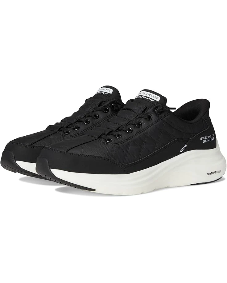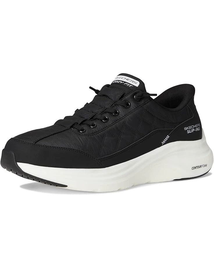- Make a move in flexible comfort wearing the SKECHERS® Contour Foam Cozy Fit Hands Free Slip-in shoes. Designed with an exclusive Heel Pillow™, these lace-up sneakers feature a breathable deconstructed quilted mesh upper that provides a roomy flexible fit for enhanced comfort. The Skechers Air-Cooled Memory Foam® comfort insole offers pressure relief, instant comfort, and breathability while the gel-infused, high-rebound memory foam cushioning contours to most foot shapes. Designed with a flexible slip-on front for a comfortable fit, these lace-up sneakers add performance comfort to casual occasions. Wear them indoors, around the house, to and from work, business, for travel, or even while driving; the possibilities continue.