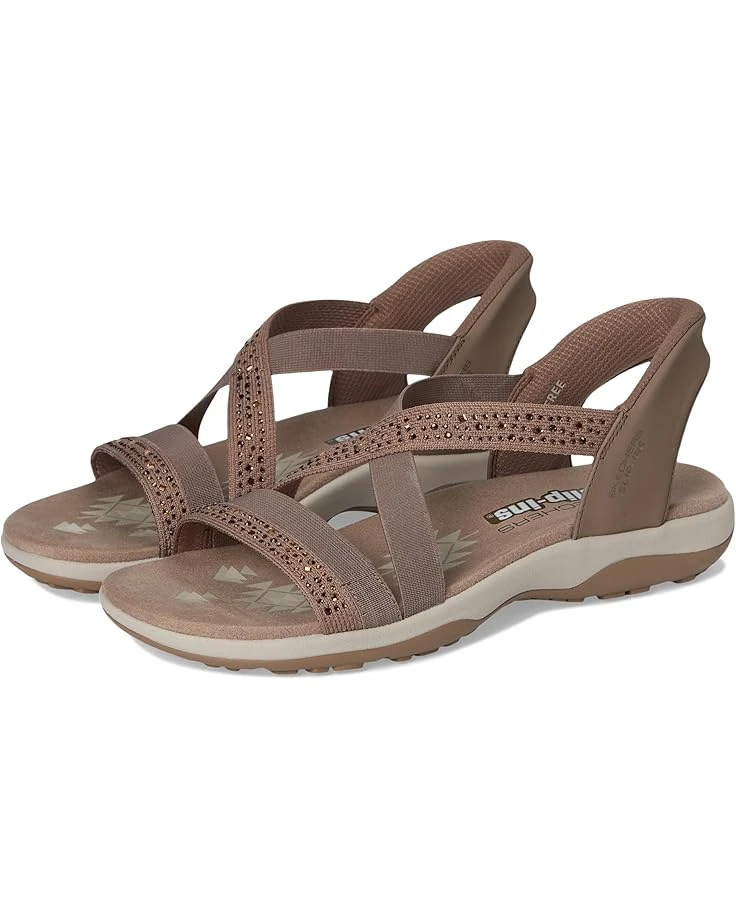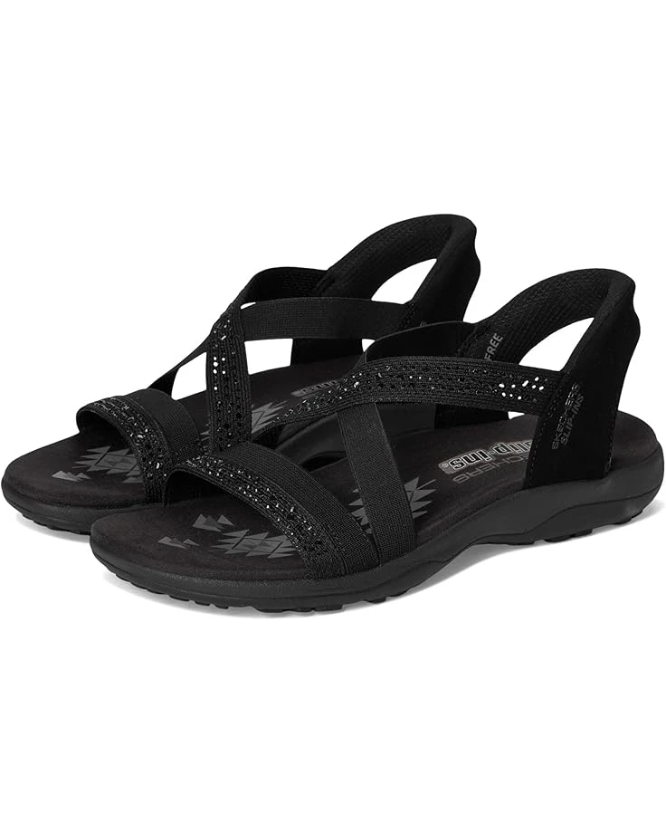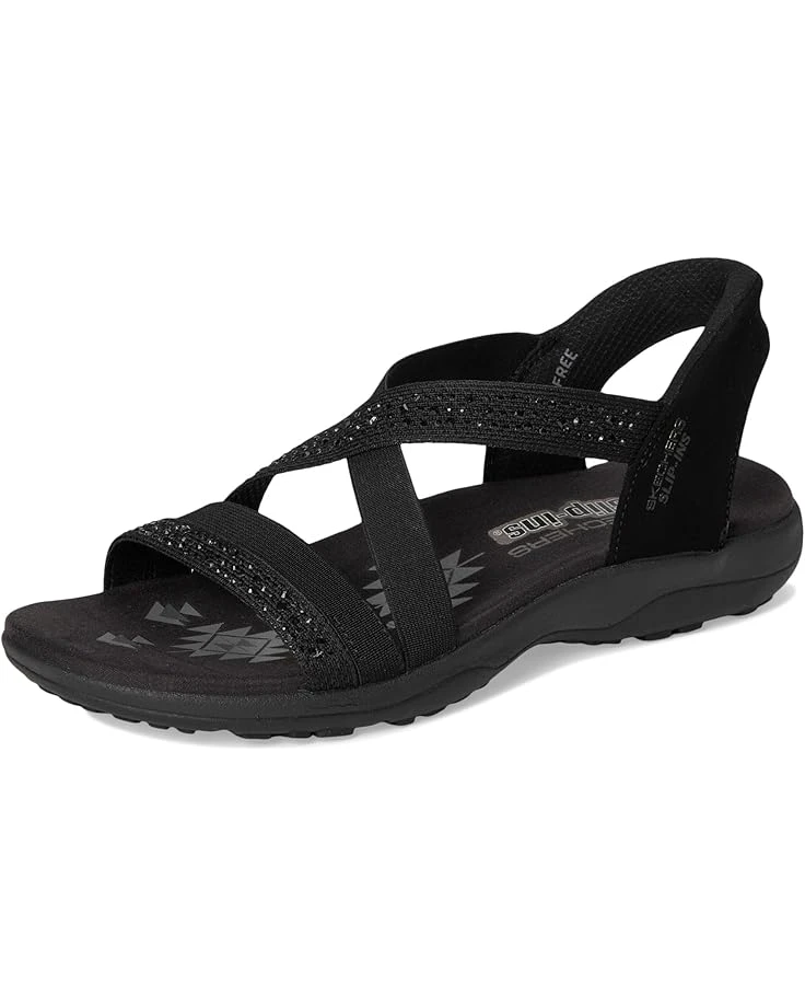 - Enjoy sunny days in sparkly comfort with SKECHERS® Hands Free Slip-ins: Reggae Slim – Summer Sparkle. Designed with the Heel Pillow™, this strappy sandal features a stretch fabric strap upper with a back heel piece and cushioned footbed.