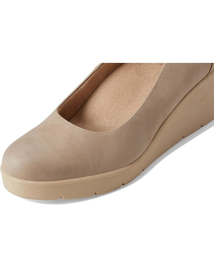 - From brunch to exploring, the Naturalizer® Soul Naturalizer About Time wedge is your go-to for casual chic. Featuring a chic, closed-toe design with a versatile polyurethane upper and faux leather insole, this shoe combines durability and luxury with a recycled polyester lining. The ContourFIT™ technology ensures a perfectly sculpted insole with soft foam lining, providing arch support and memory foam cushioning to keep your feet comfy all day. Designed with elasticized goring for extra flexibility, this pull-on wedge heel offers ease and comfort, while the sock lining keeps things fresh. A lightweight, flexible outsole completes the look, giving you all the support you need for effortless style and all-day wearability.