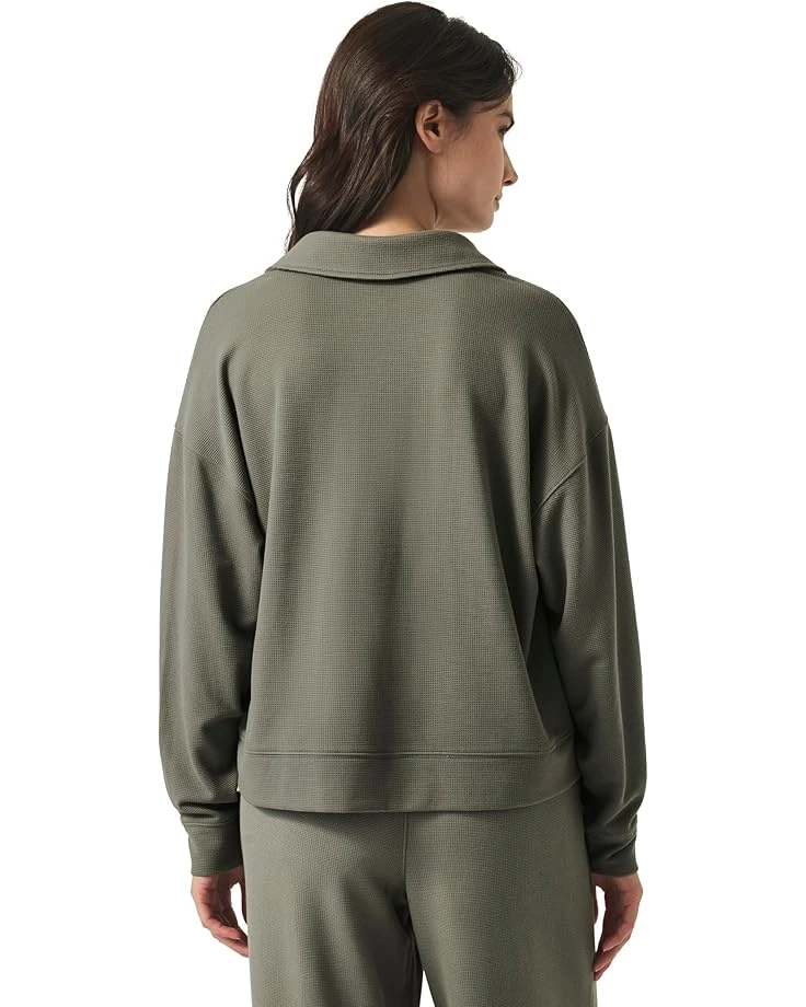 - Sporty, chic, and cozy-redefining everyday comfort wearing the Splendid® Waffle Scuba Polo Sweatshirt, where effortless style meets ultimate coziness. Designed with a relaxed fit and hip-length silhouette, this pullover blends laid-back ease with polished appeal. The soft waffle scuba fabric offers a plush, breathable feel, while the collared V-neckline adds a sporty-chic touch. Dropped shoulders and long sleeves enhance the relaxed vibe, making it perfect for layering or wearing solo.