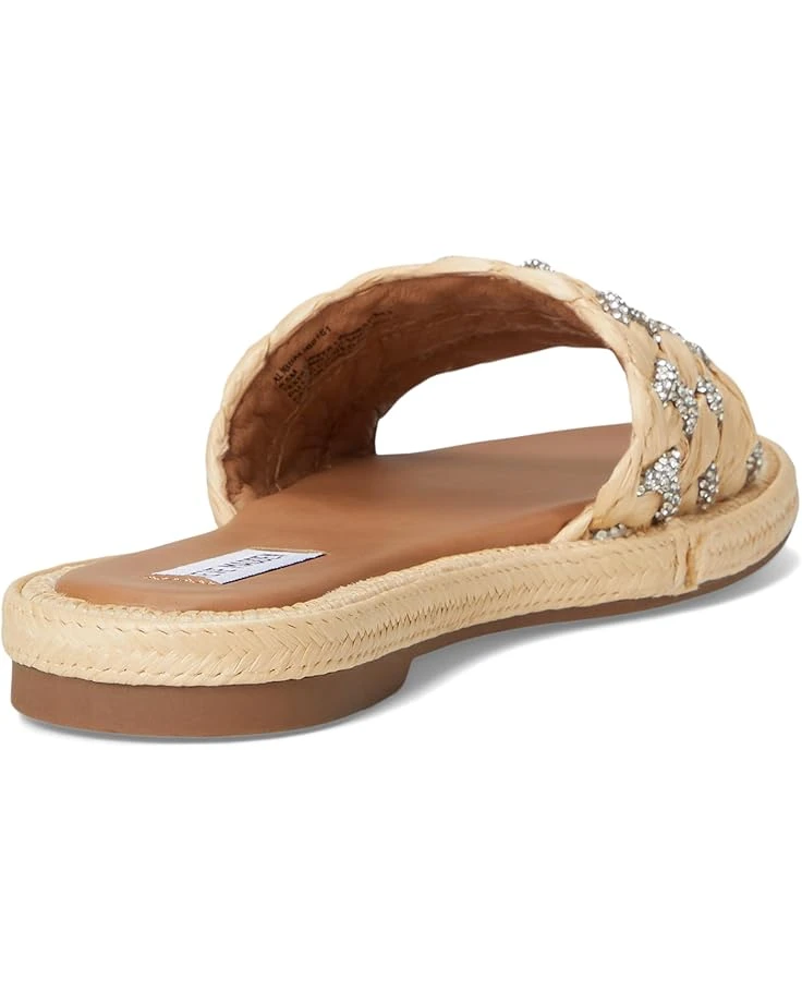 - Shimmer, stroll, repeat – your Alibi from Steve Madden® awaits! Slip into effortless elegance with the Steve Madden ALIBI sandal, your go-to for sunny escapes and city strolls. Featuring a chic woven raffia upper with subtle rhinestone accents, these sandals bring a perfect mix of boho charm and sparkle to every step. The faux leather lining and insole offer a soft, comfortable feel, while the flat synthetic rubber outsole ensures all-day ease. Designed with a breezy open-toe slip-on style, they’re as effortless as your summer plans.