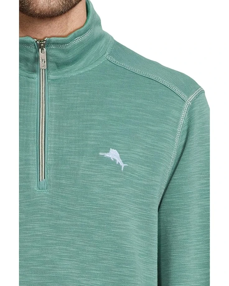 - Thoughtfully designed with the modern man in mind, the Tommy Bahama® Tobago Bay Half Zip is more than just an outerwear. This slubbed texture shirt features stand collar neckline with zippered closure, long sleeves, contrast top stitching details, brand logo on the left chest, and straight hem.