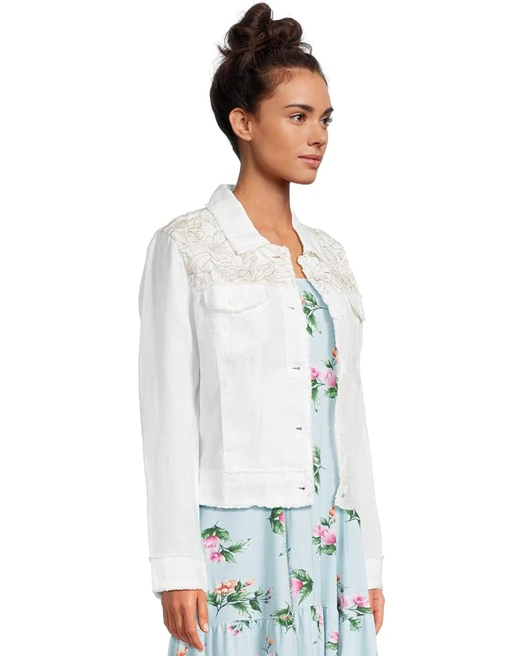 - Artistry meets apparel: The Tommy Bahama® Two Palms Flora Fresco Jacket, a stunning embroidered linen jean jacket. The classic fit drapes beautifully, while vertical seaming creates a slimming silhouette that flatters every figure. A collared neck and button front closure add timeless structure, complemented by double button-through chest pockets and convenient side slit pockets for a touch of utility. Designed with long sleeves for versatile wear, this breezy, lightweight layer is perfect for sunlit strolls, seaside escapes, or effortlessly refined everyday looks.