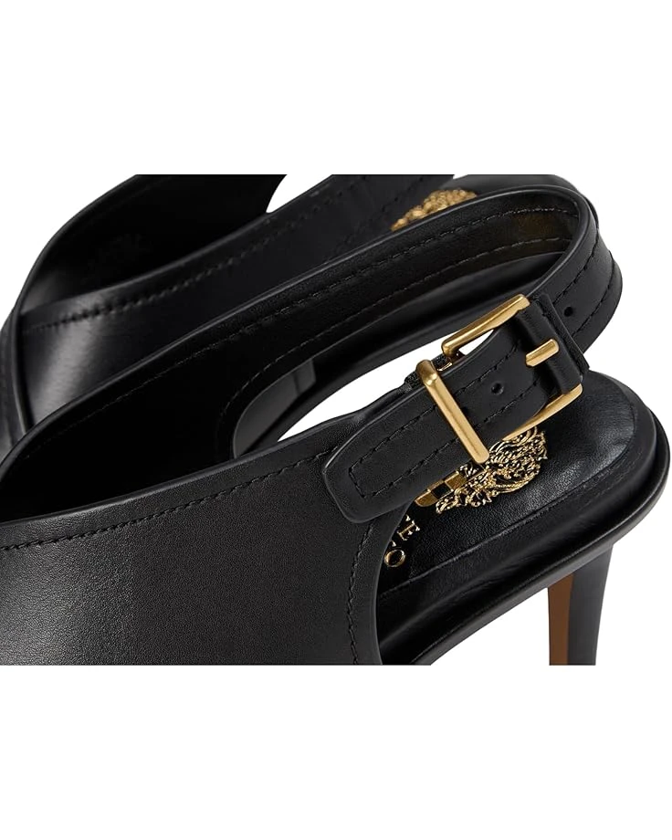 - Walk like you own the world wearing the Vince Camuto® Famla Cross-band High Heel Sandals. Crafted from leather upper, synthetic lining, and insole, this pair of sandals features round toe, crisscross X-band detailing on the upper, stiletto heel, buckle closure slingback strap, and brand detailing on the footbed.
