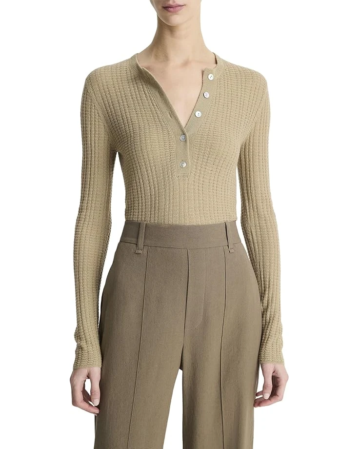 - Designed with a slim fit, this Vince® Waffle Knit Henley is an elevated take on the everyday Henley is crafted from cashmere and silk in a textural waffle pointelle. The pull-on style top features a henley neck, long sleeves, half-button closure, and a standard length.